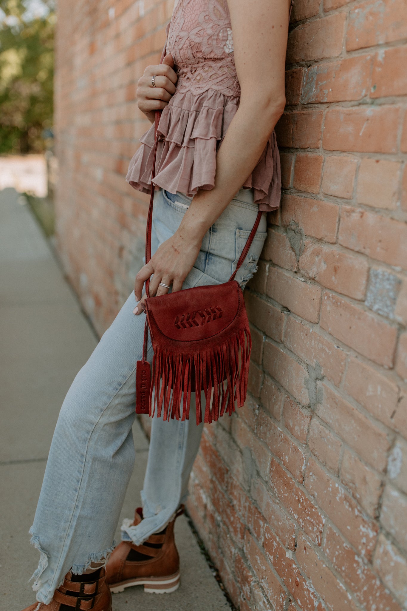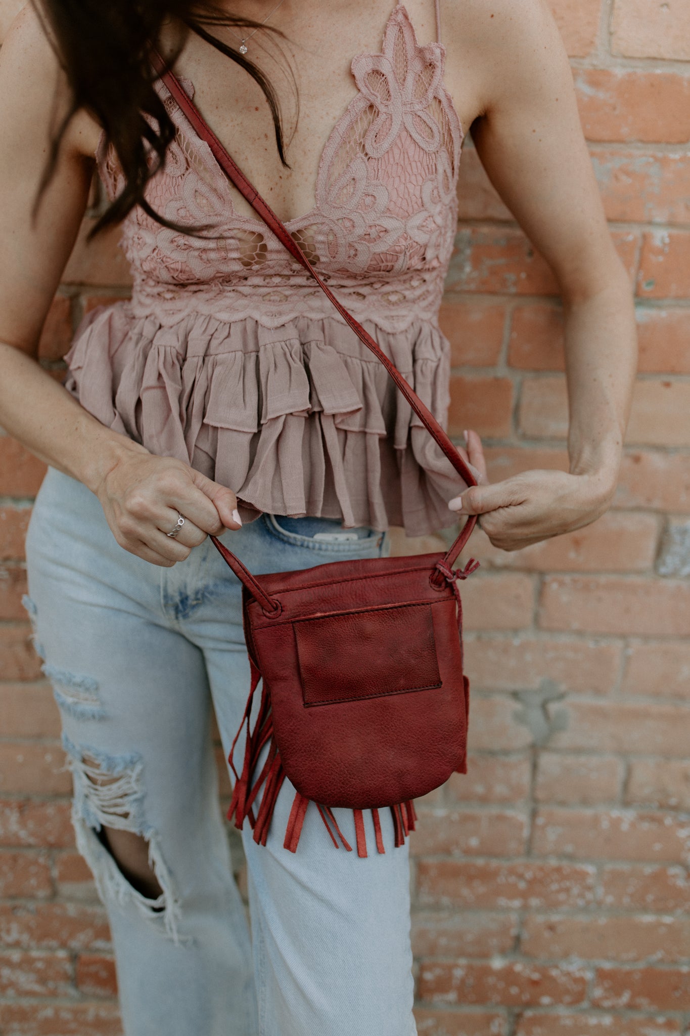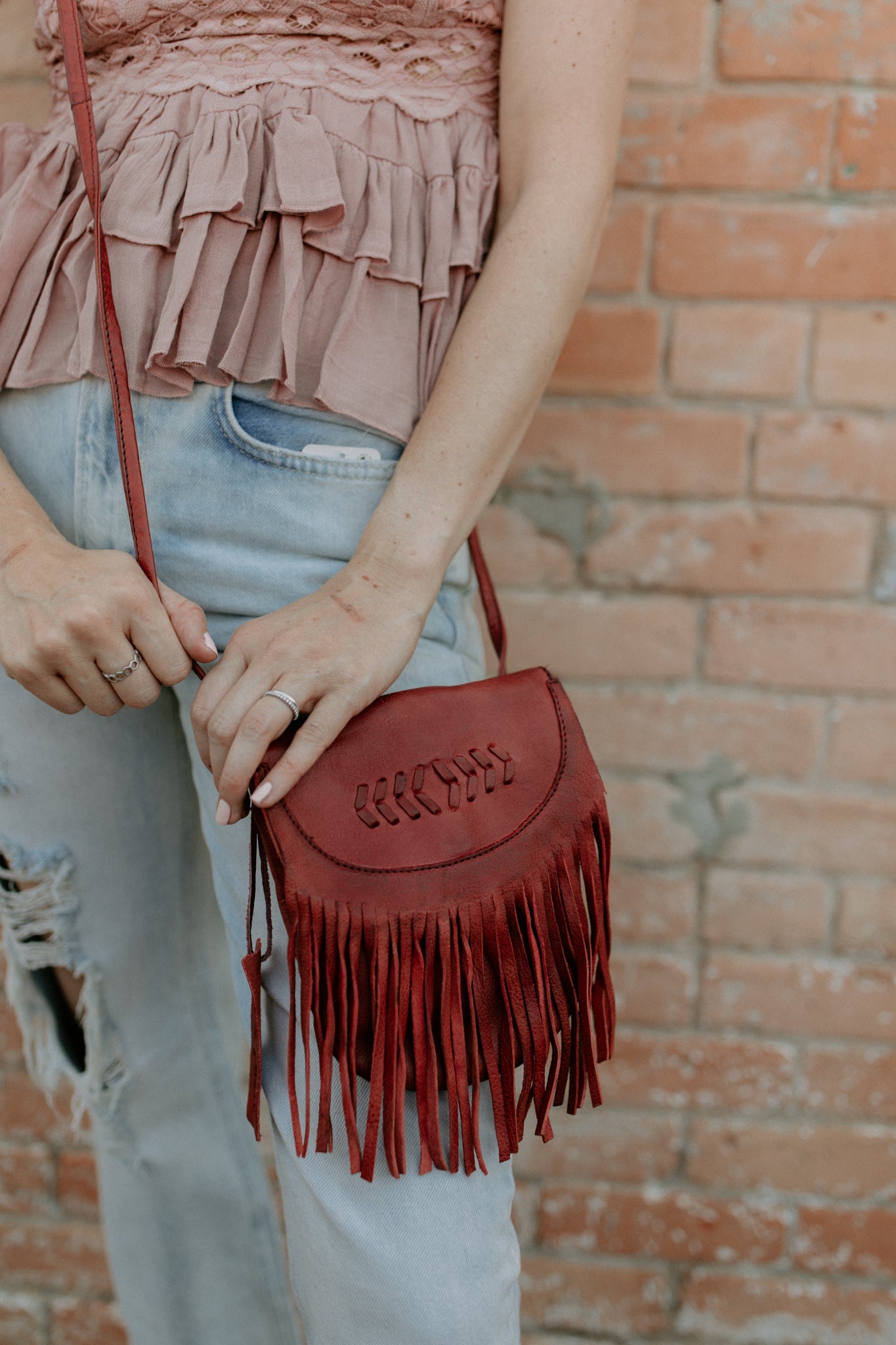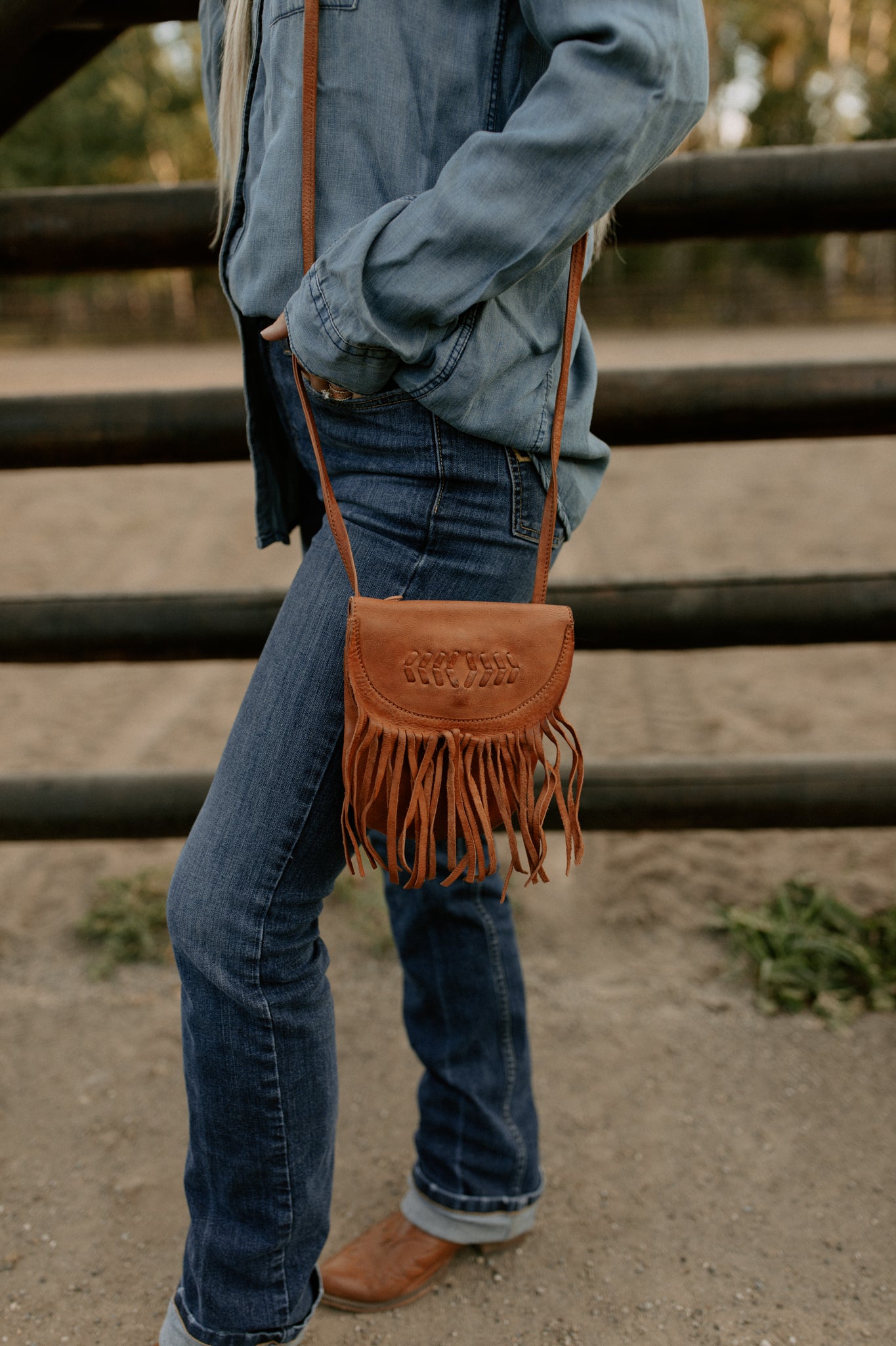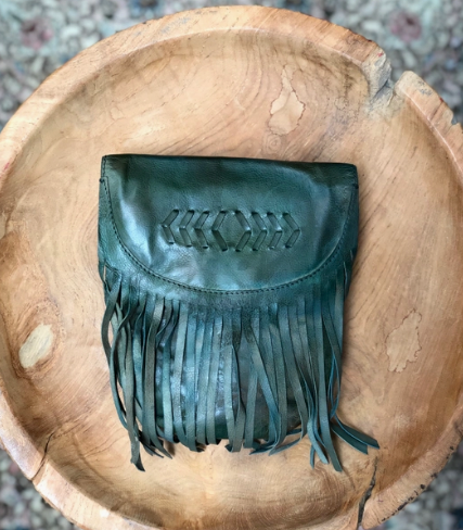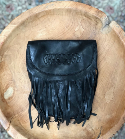 Adorable leather crossbody bag with fringe and button snap closure. The backside belt loop can be used to be made into a belt bag with a slip pocket for a cell phone. Inside has 3 credit card and cash slips.