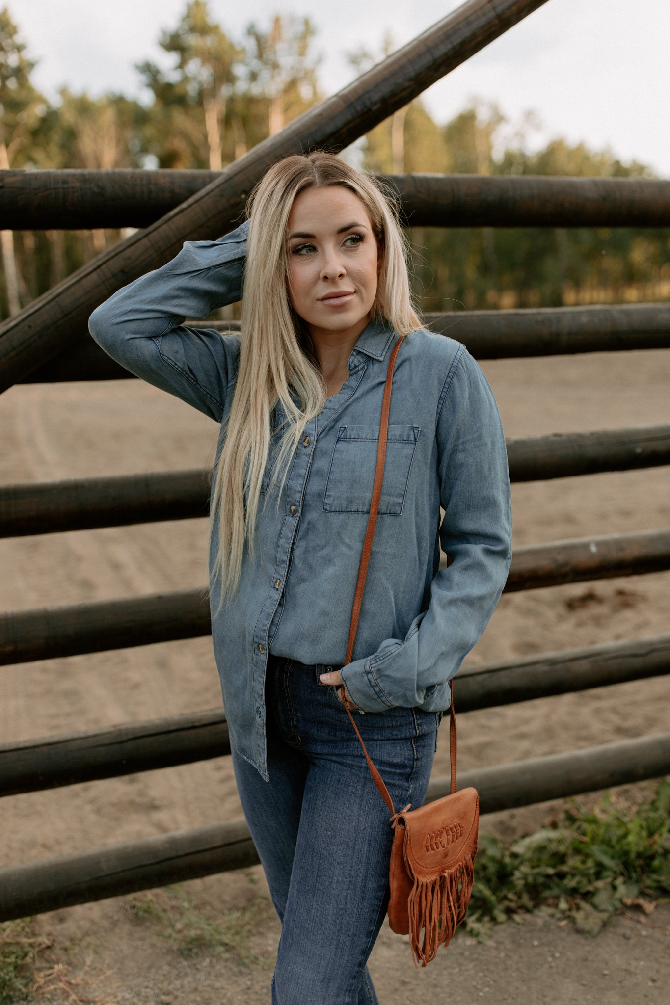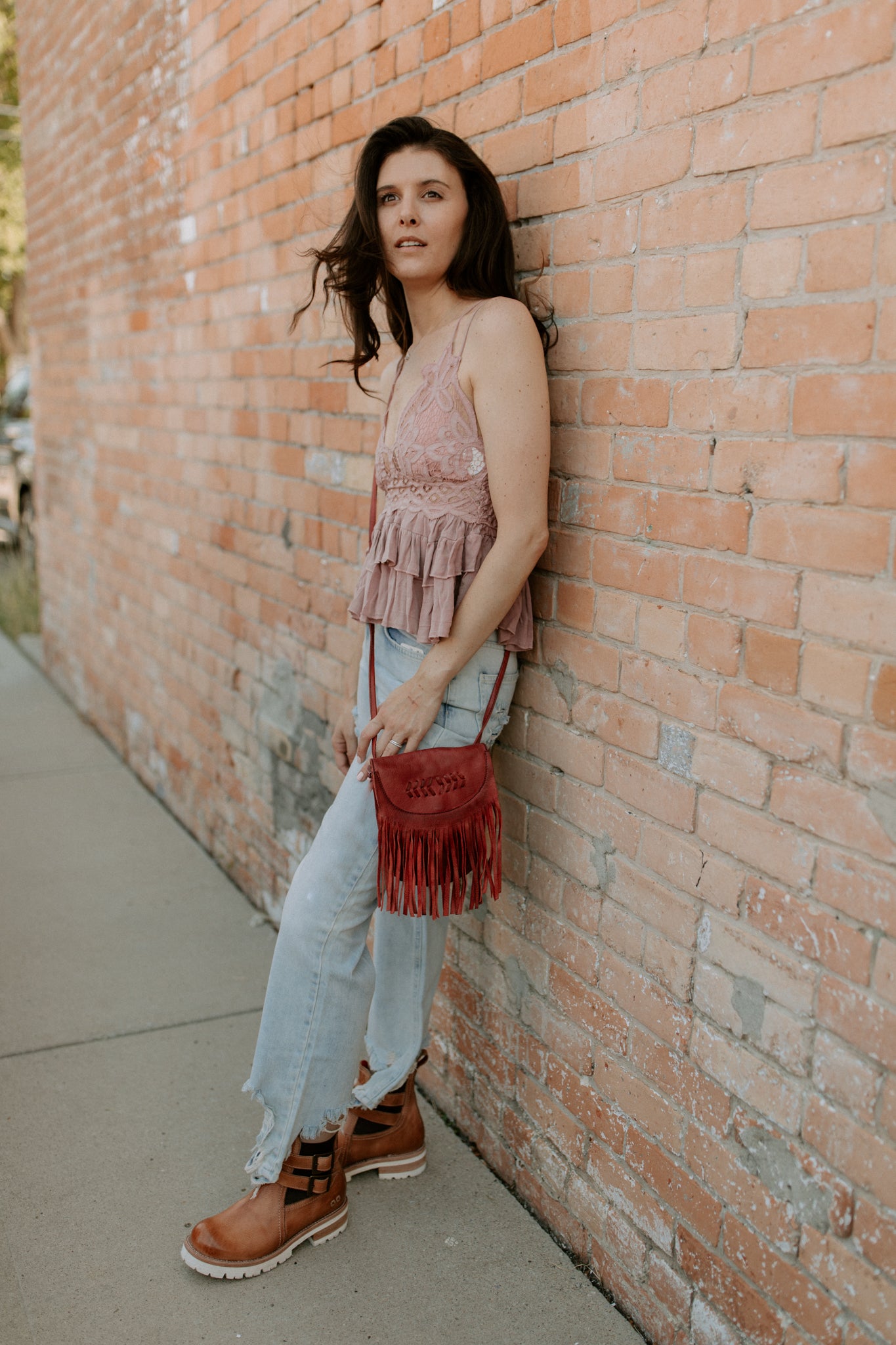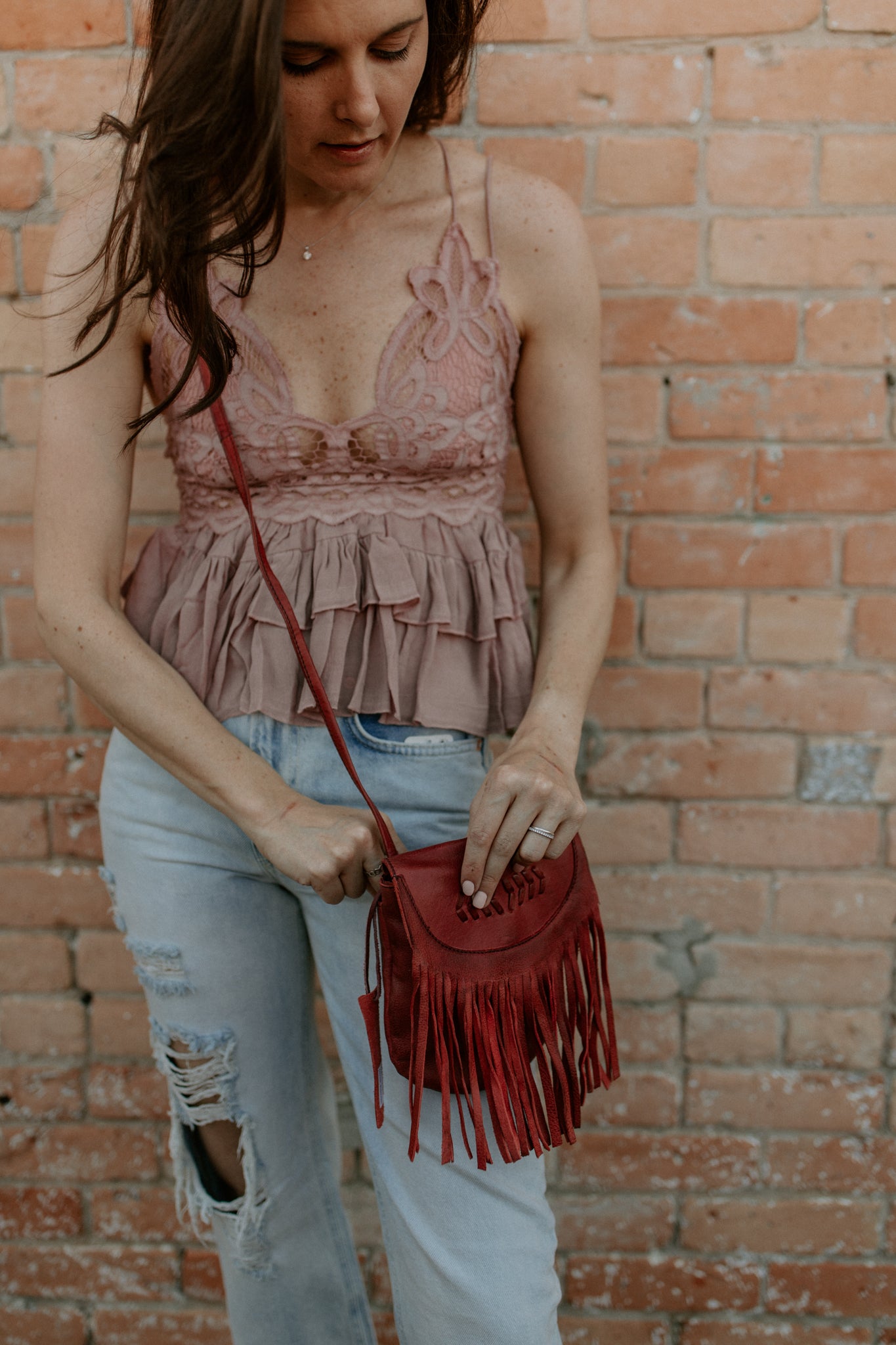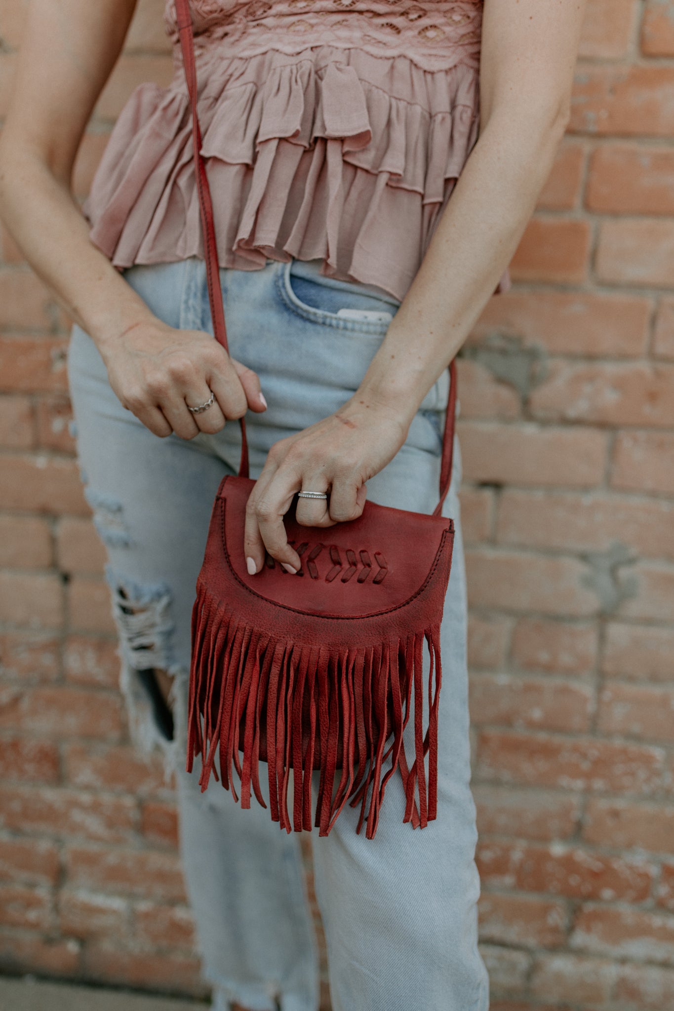 Adorable leather crossbody bag with fringe and button snap closure. The backside belt loop can be used to be made into a belt bag with a slip pocket for a cell phone. Inside has 3 credit card and cash slips.