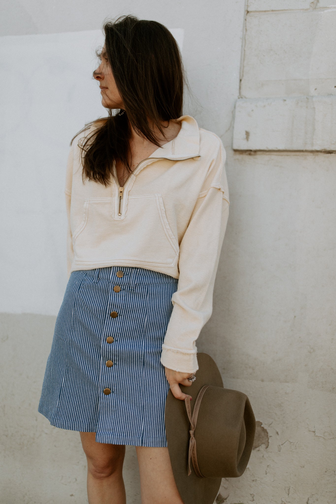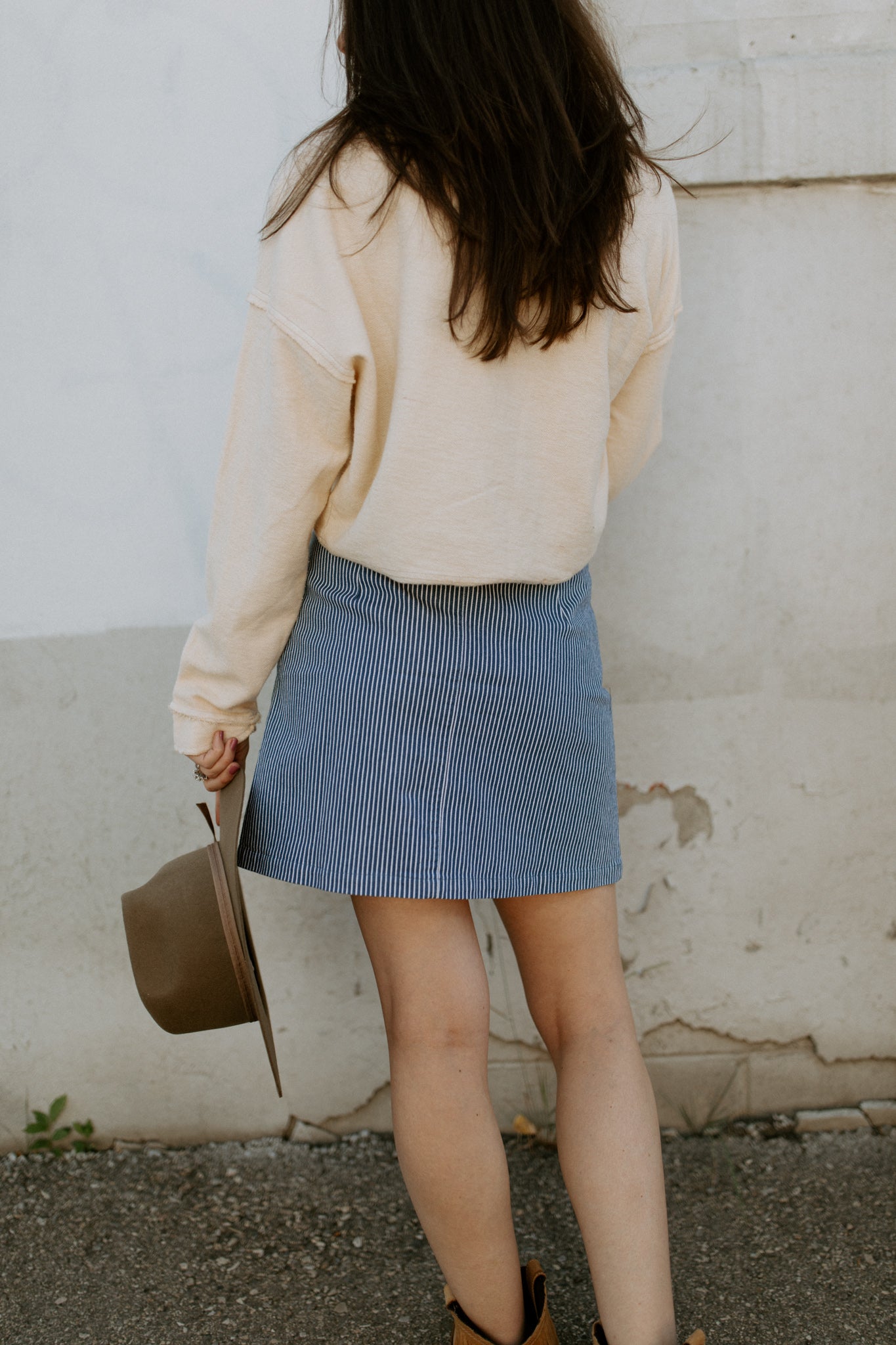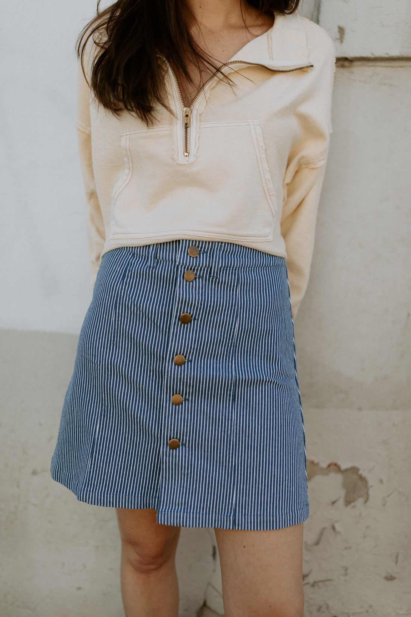 Regular price $79.95 CADThis ultra sleek retro mini was made for your all-night dance parties listening to your favourite vinyl albums. The soft and stretchy woven stretch denim provides comfort while the brushed brass snap buttons draw attention to the perfect A-line frame. The Swinging Sixties never looked so good.