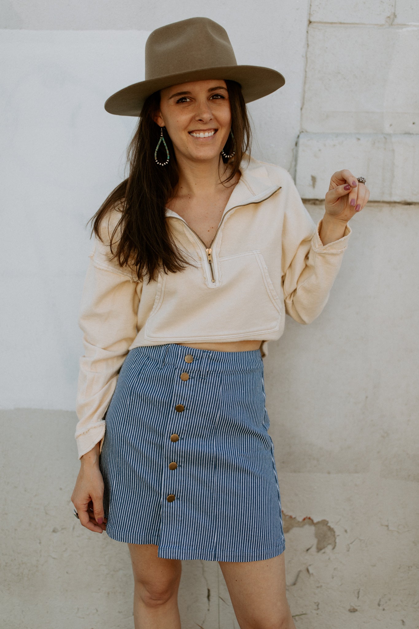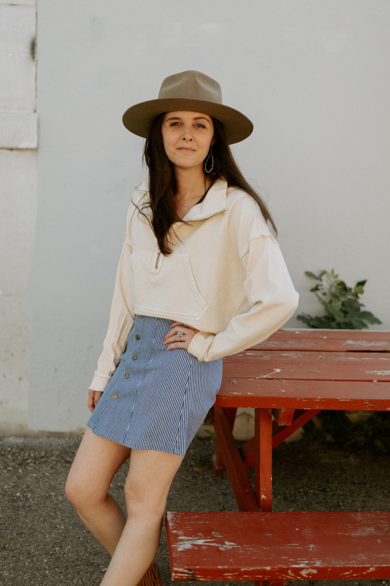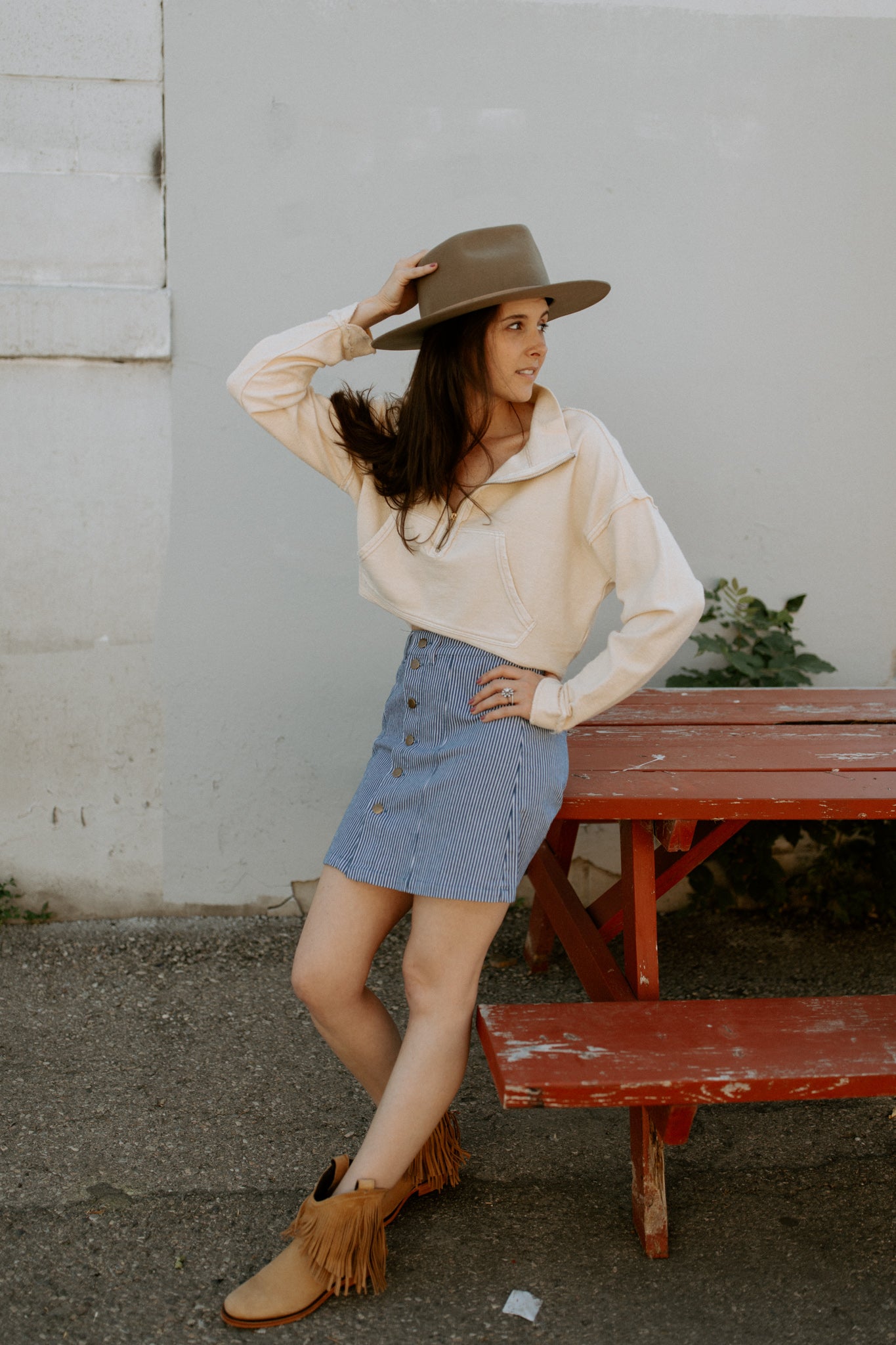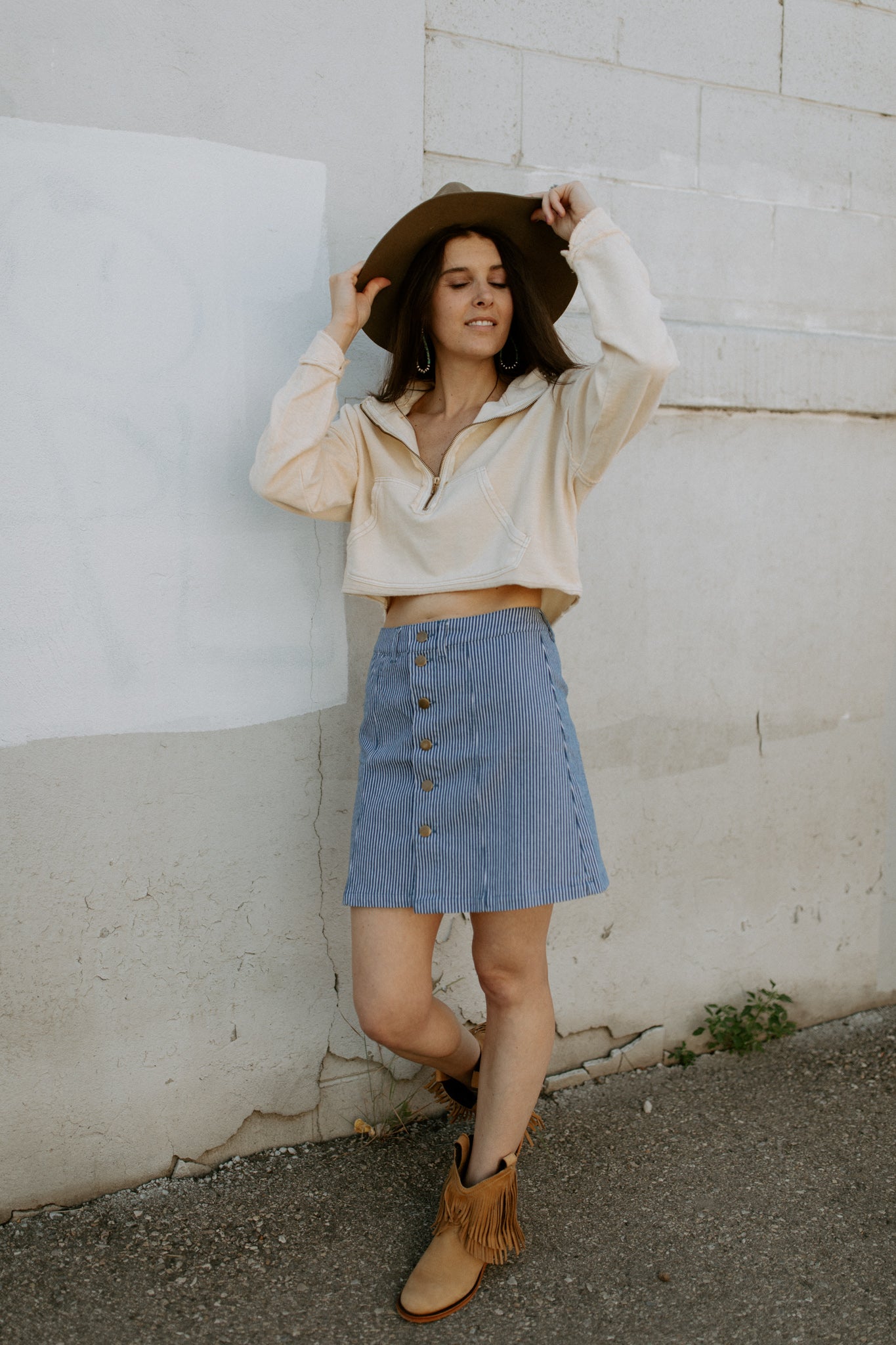 Regular price $79.95 CADThis ultra sleek retro mini was made for your all-night dance parties listening to your favourite vinyl albums. The soft and stretchy woven stretch denim provides comfort while the brushed brass snap buttons draw attention to the perfect A-line frame. The Swinging Sixties never looked so good.