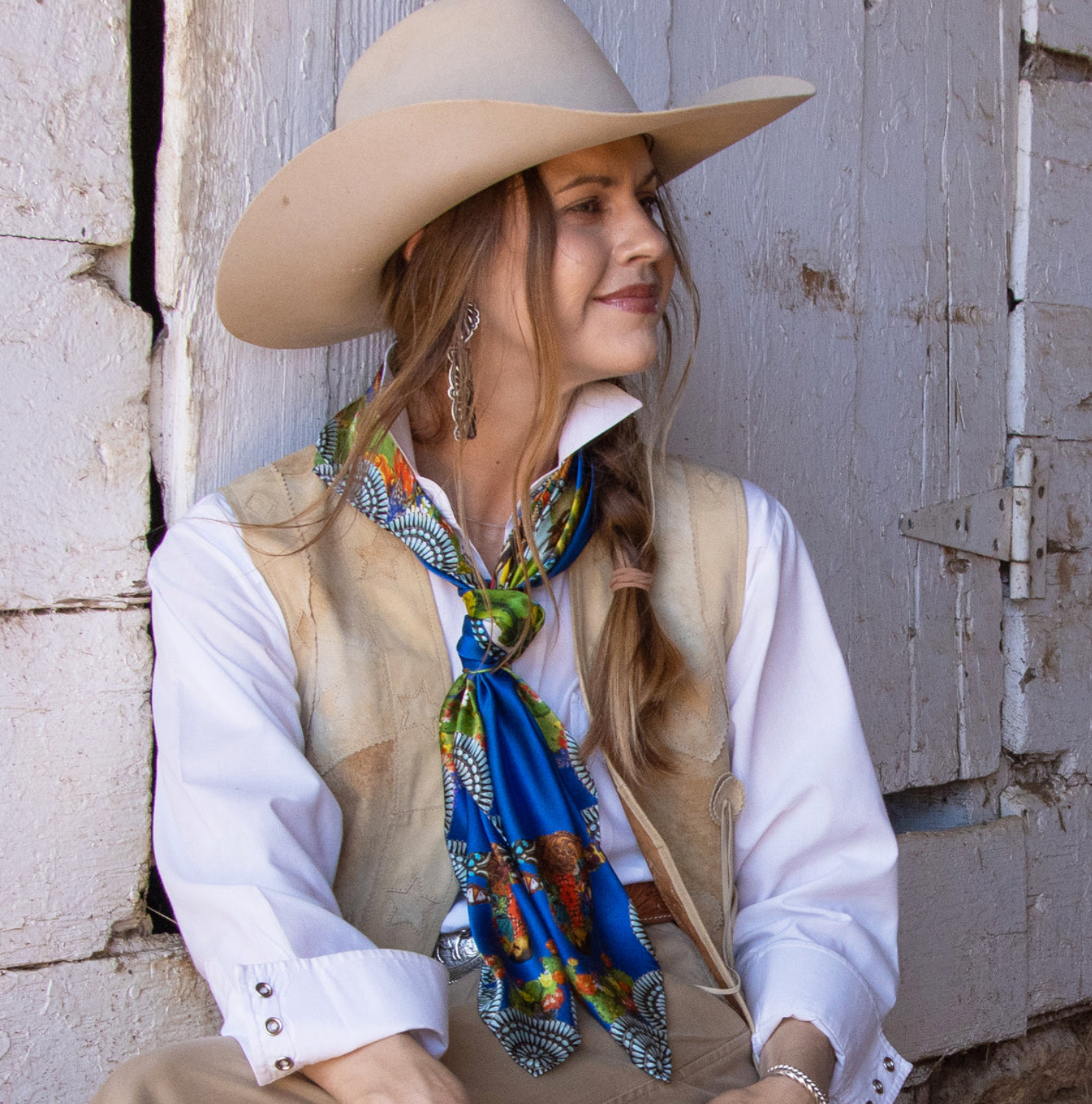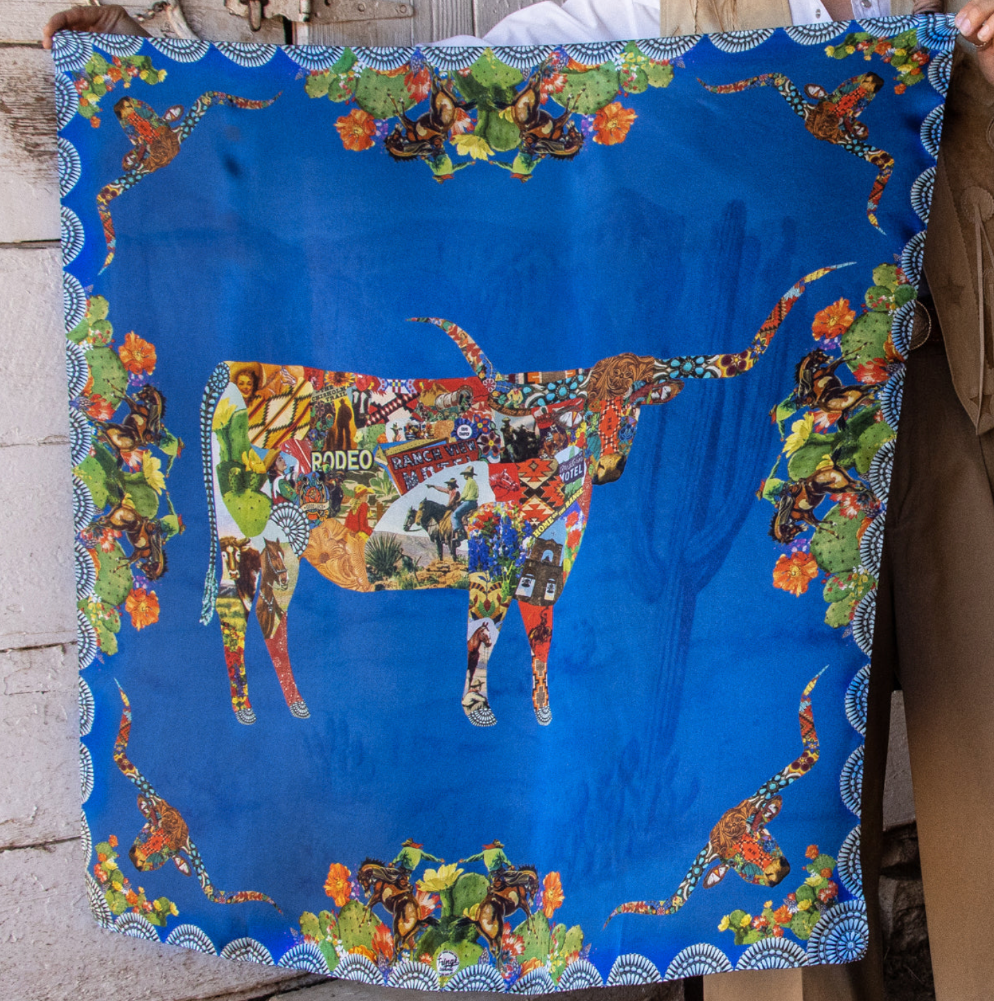 The all new Pecos was designed by my friend Amy Moorhouse and is a favorite this season! You will love this collage style longhorn, using pieces of jewelry, rugs, tapestry and collectibles from Amy's own collection. Notice the turquoise concho border and just inside are the floral edges intertwining with bronc riders and cactus. All of this with a lightly screened back desert scene on a bright, royal blue background.