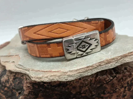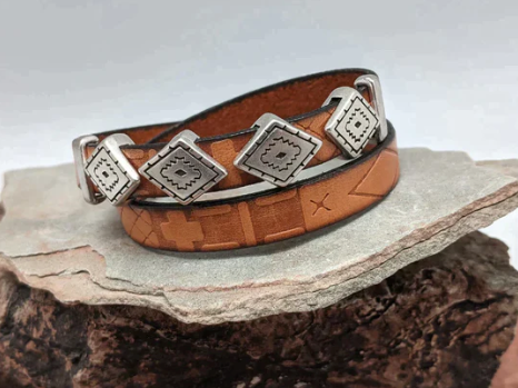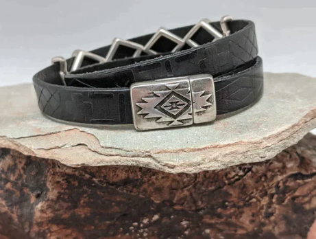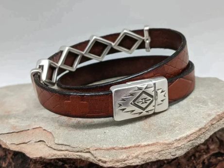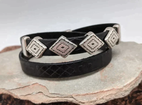 Southwest pattern embossed leather wrap bracelet has four antique silver diamond sliders. Southwestern pattern on the magnetic clasp with an easy-open thumbnail slot that stays put.