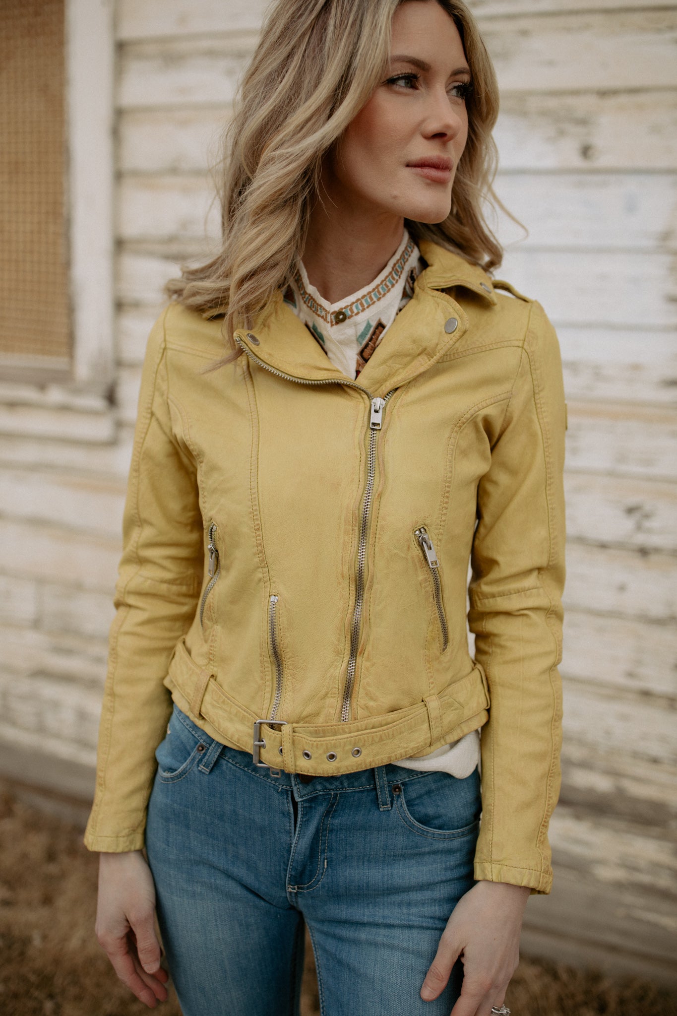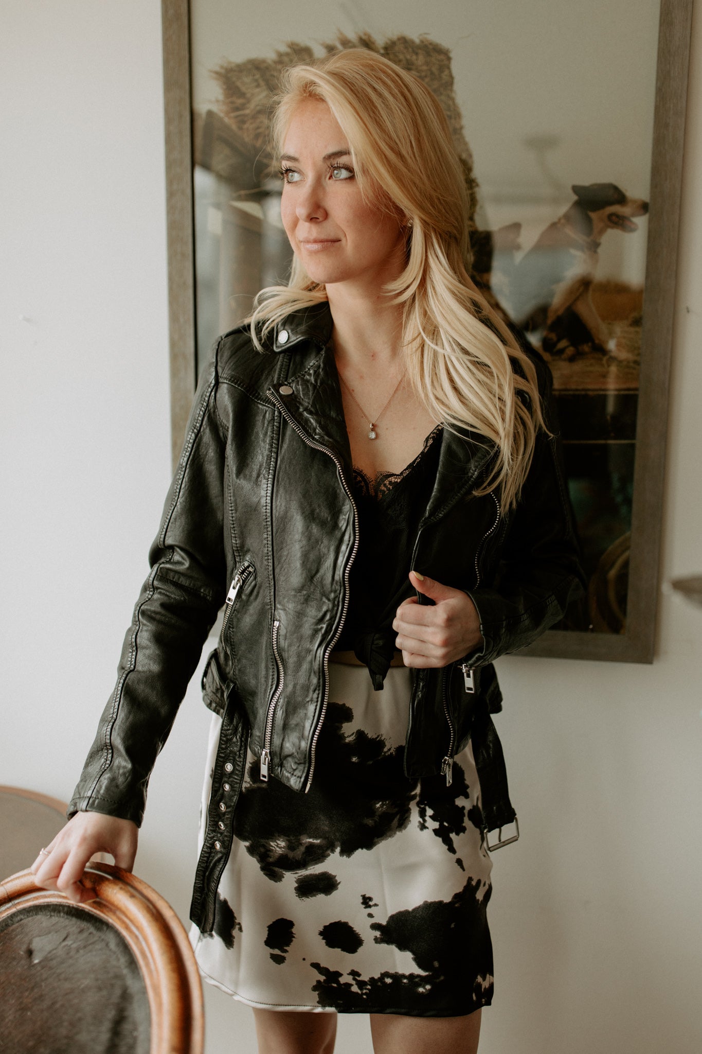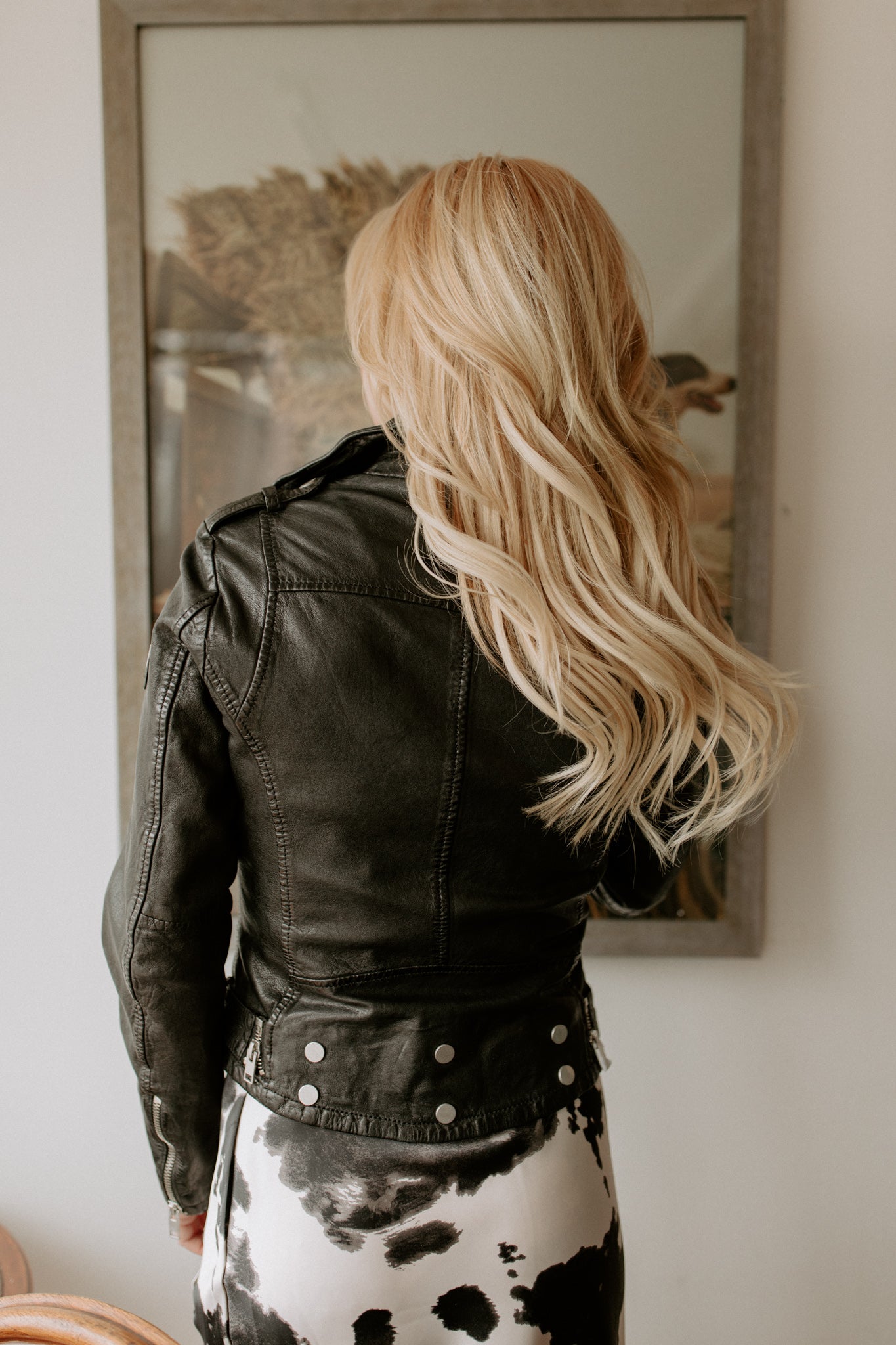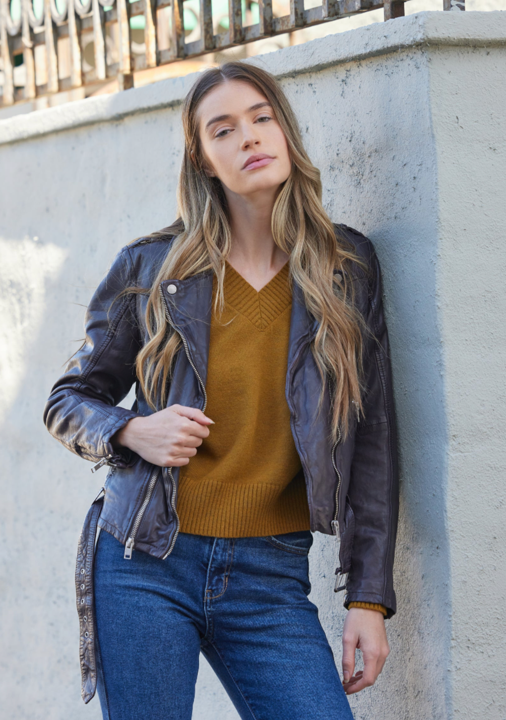 This leather jacket features enough embellishment to walk the line between elegant and edgy. You can dress this jacket casual while you're on the go, or class it up for a night out. The perfect fit, Wild features a detailed collar and belt around the waist making a snug style.