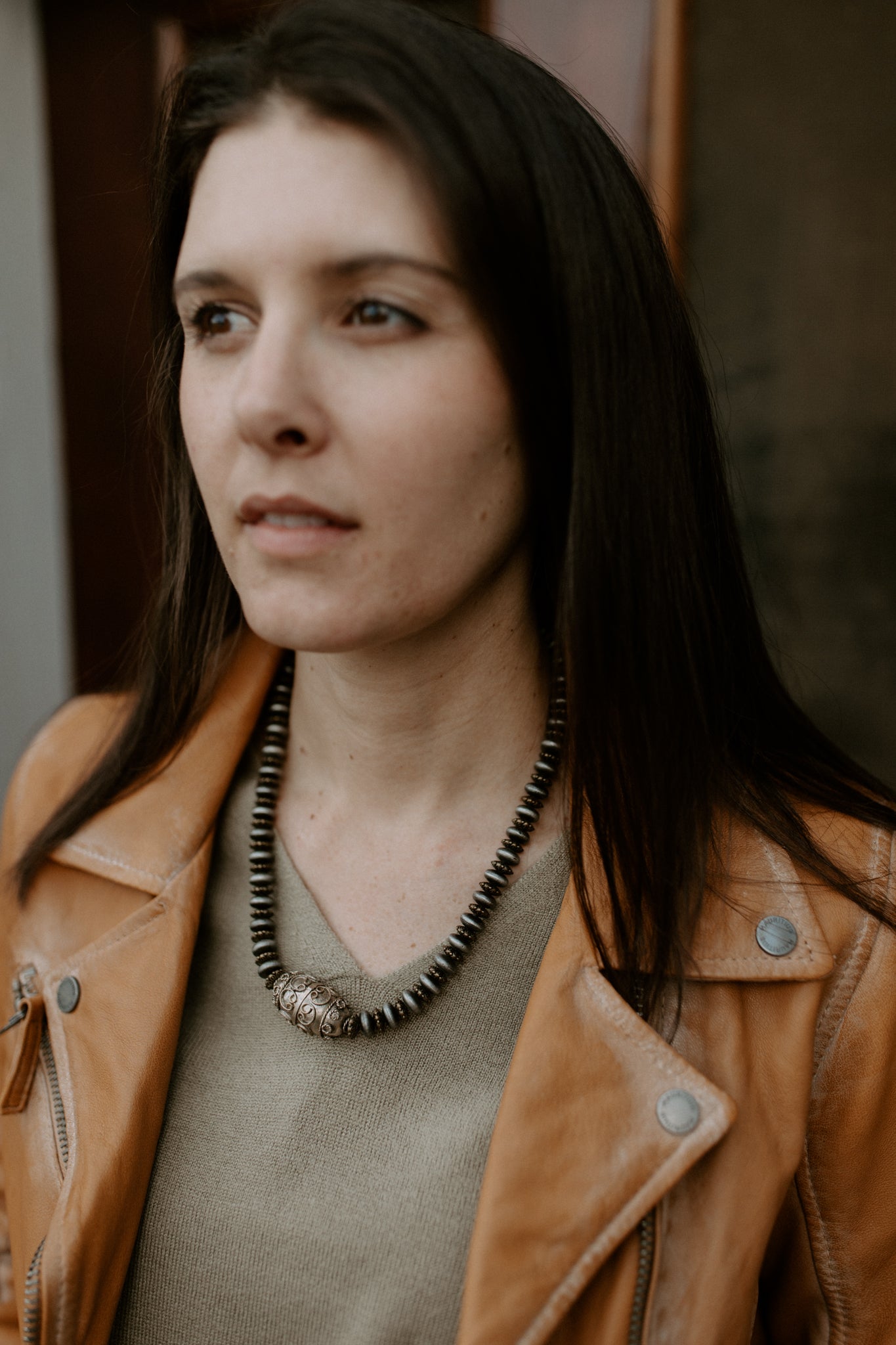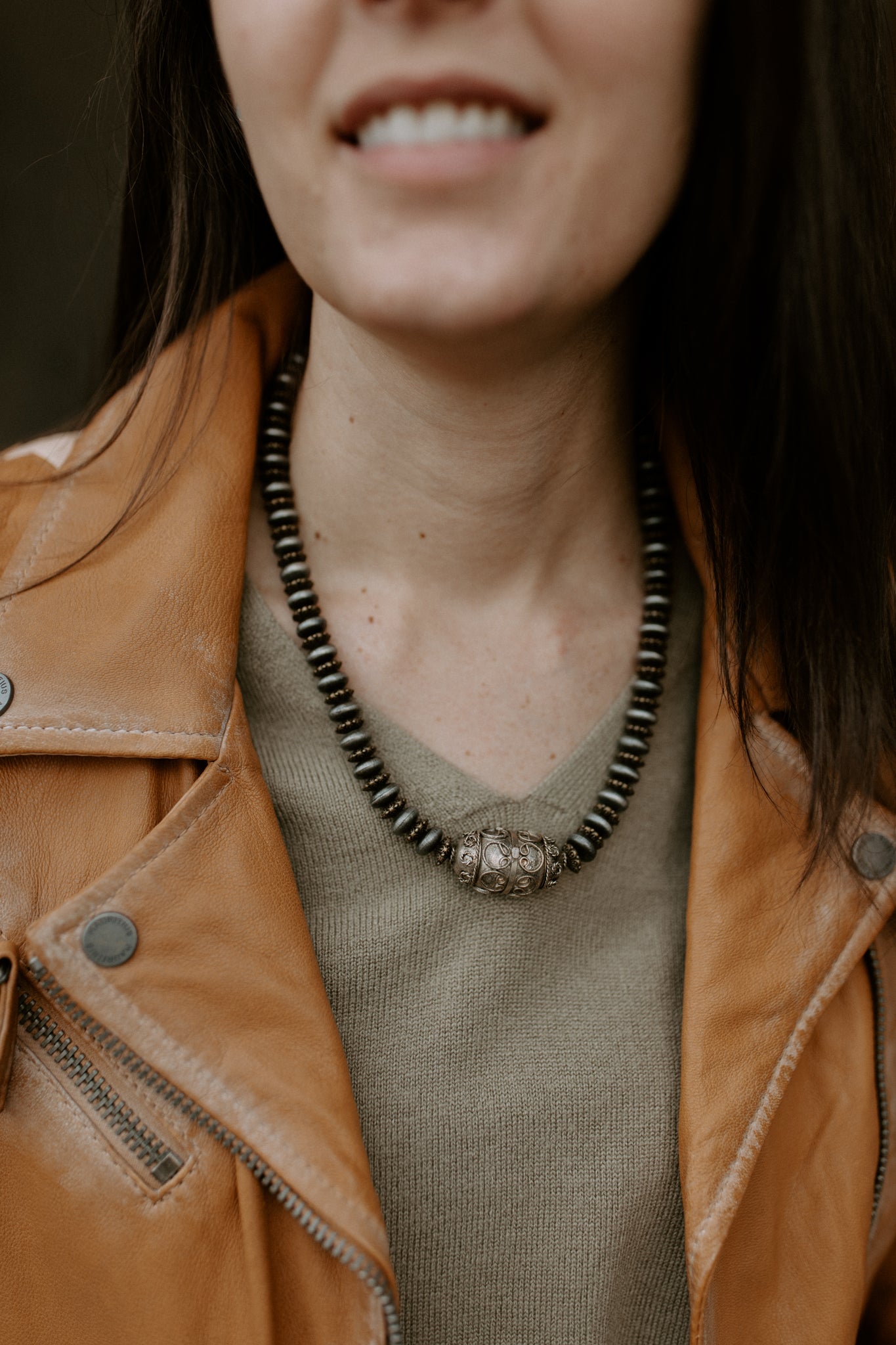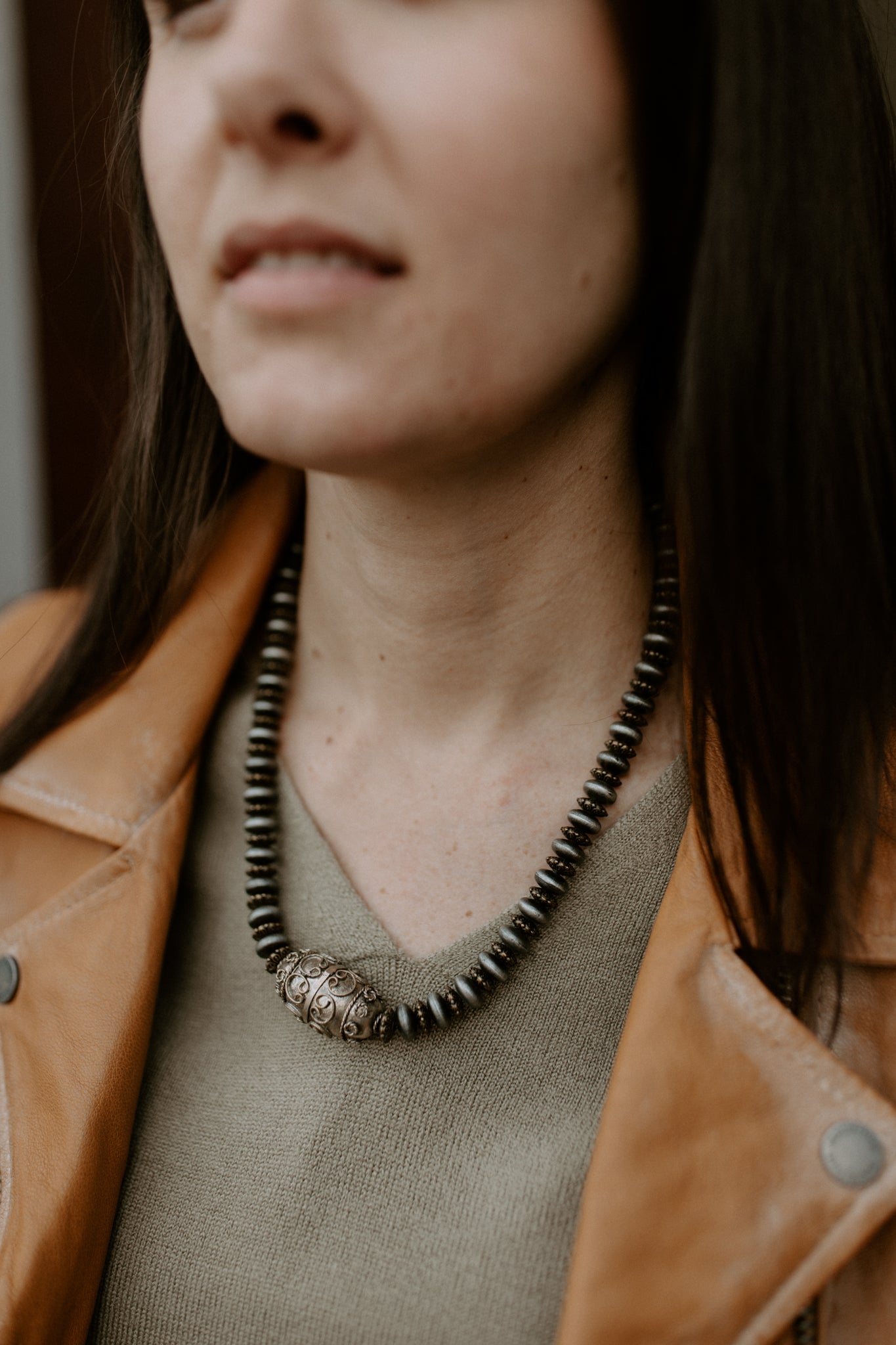 A patterned mix of faux navajo pearls and beading. Finished with a chunky statement bead in the center. We love how this looks alone, but especially layered with other necklaces!