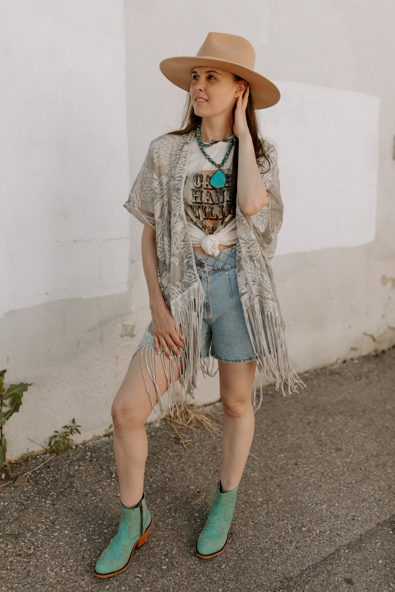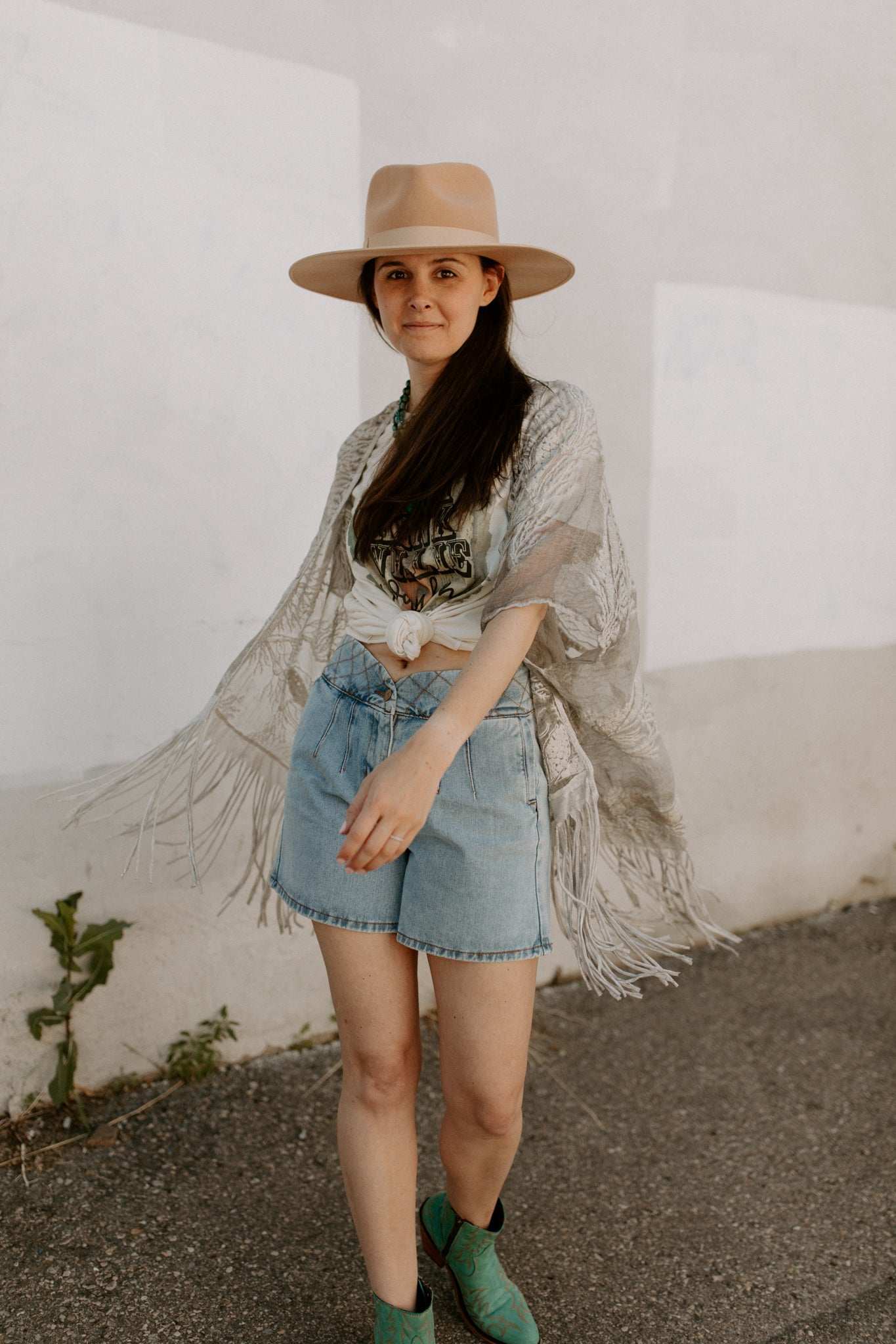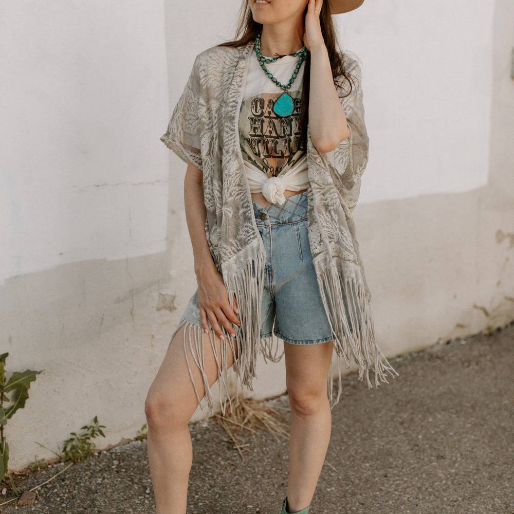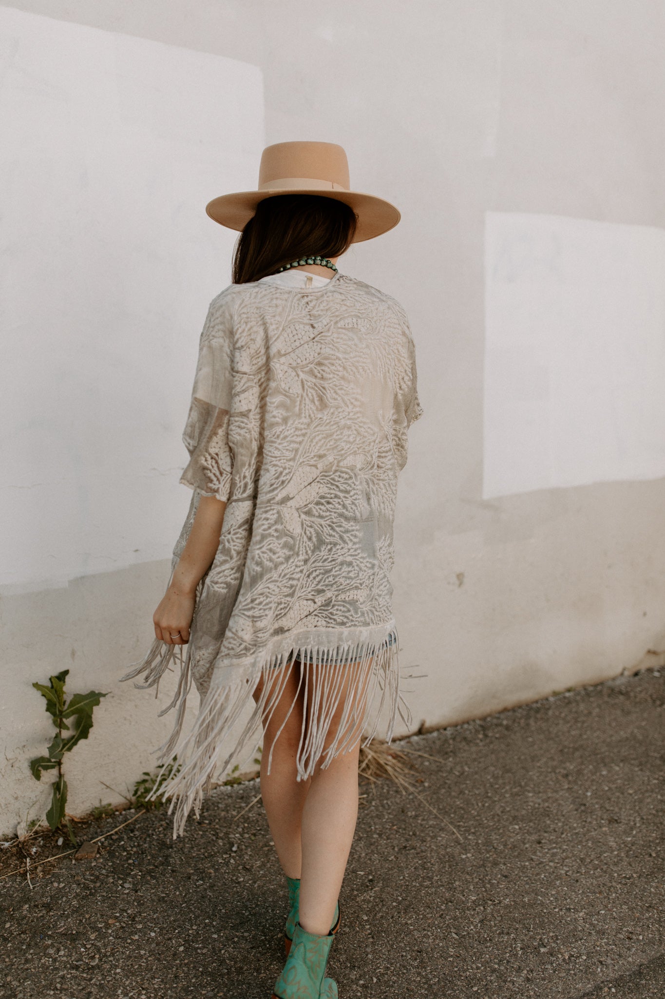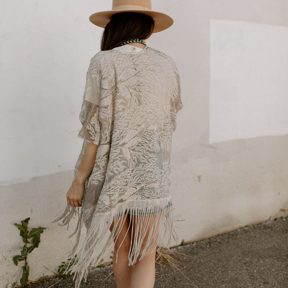 Feel like royalty in this gorgeous duster! 100% silk with cotton embroidery. A high-low silhouette and ruffled 3/4 length sleeves. The perfect addition to layer over your denim and white tee.