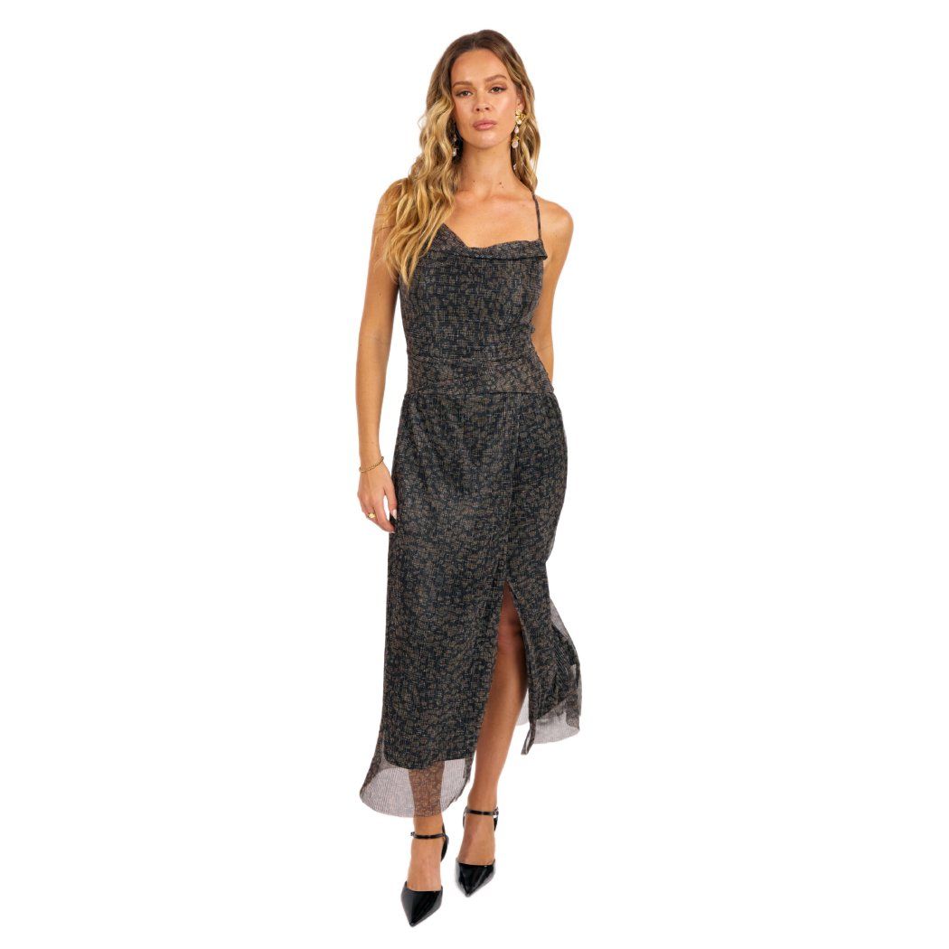 SAGE THE LABEL La Soiree Pleated Lurex Mesh High Slit Maxi Dress
