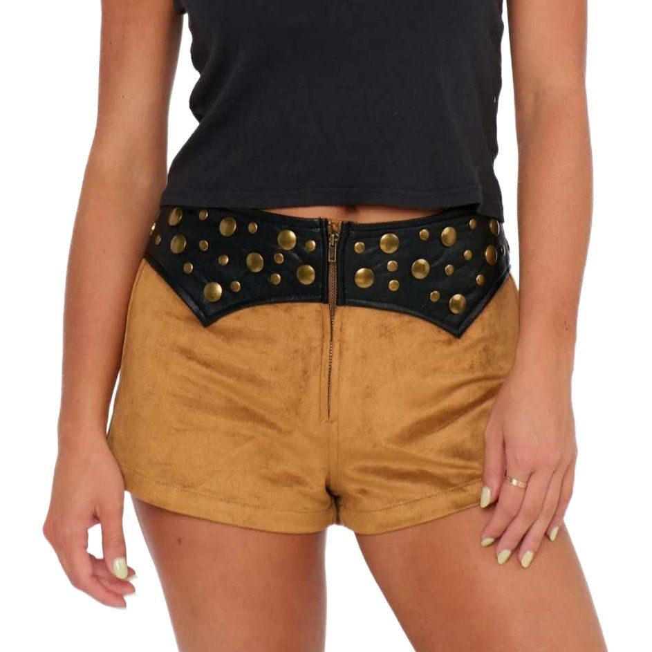 Made from soft faux suede with a sleek, micro fit, these shorts feature gold stud details for a fun western touch. Made with 90% Polyester, 10% Spandex with the contrast with 55% Cotton, 45% Polyurethane.