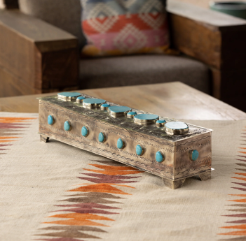 Lined with luxurious velvet and featuring a genuine turquoise stone centerpiece, this catch-all box is both tasteful and functional. Safeguard your cherished keepsakes or upgrade your home decor with this eye-catching piece that effortlessly complements any room in the house.