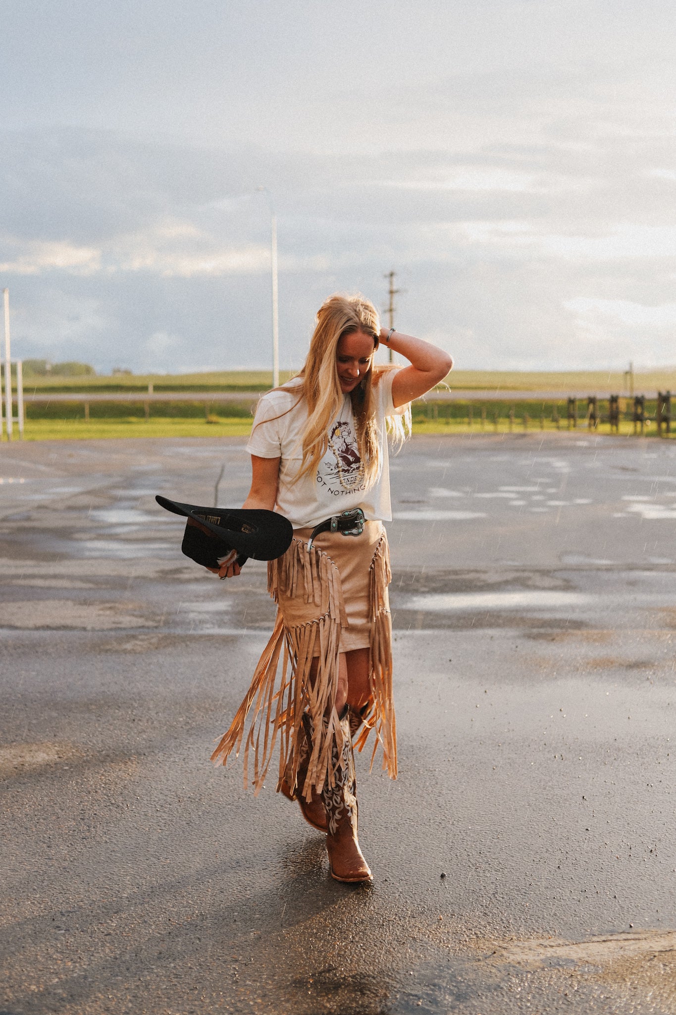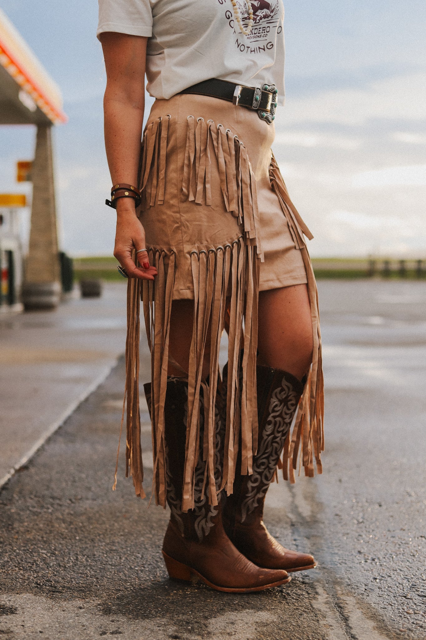 Add some western flair to your wardrobe with our Long Fringe Mini Skirt. Featuring a stylish and eye-catching fringe detail, this skirt is perfect for any cowgirl or cowboy looking to make a statement. Made with high-quality materials, this skirt is sure to become a staple piece in your closet.